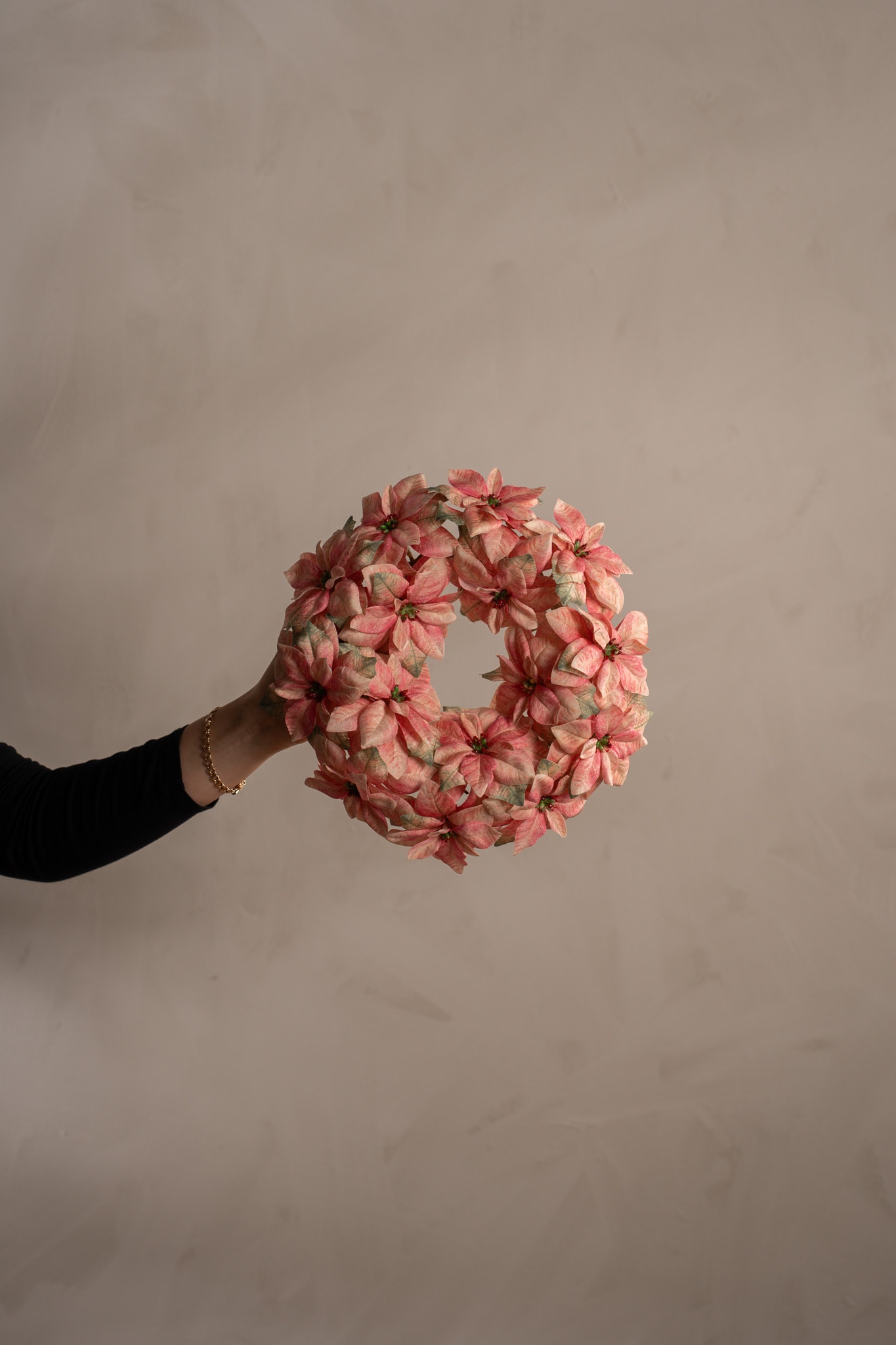 Den rosa julestjernekransen er et stilrent alternativ til den klassiske røde. Med sine myke toner og i størrelser på 30 og 50 cm passer den perfekt hvis du ønsker å skape en moderne julestemning med eleganse.