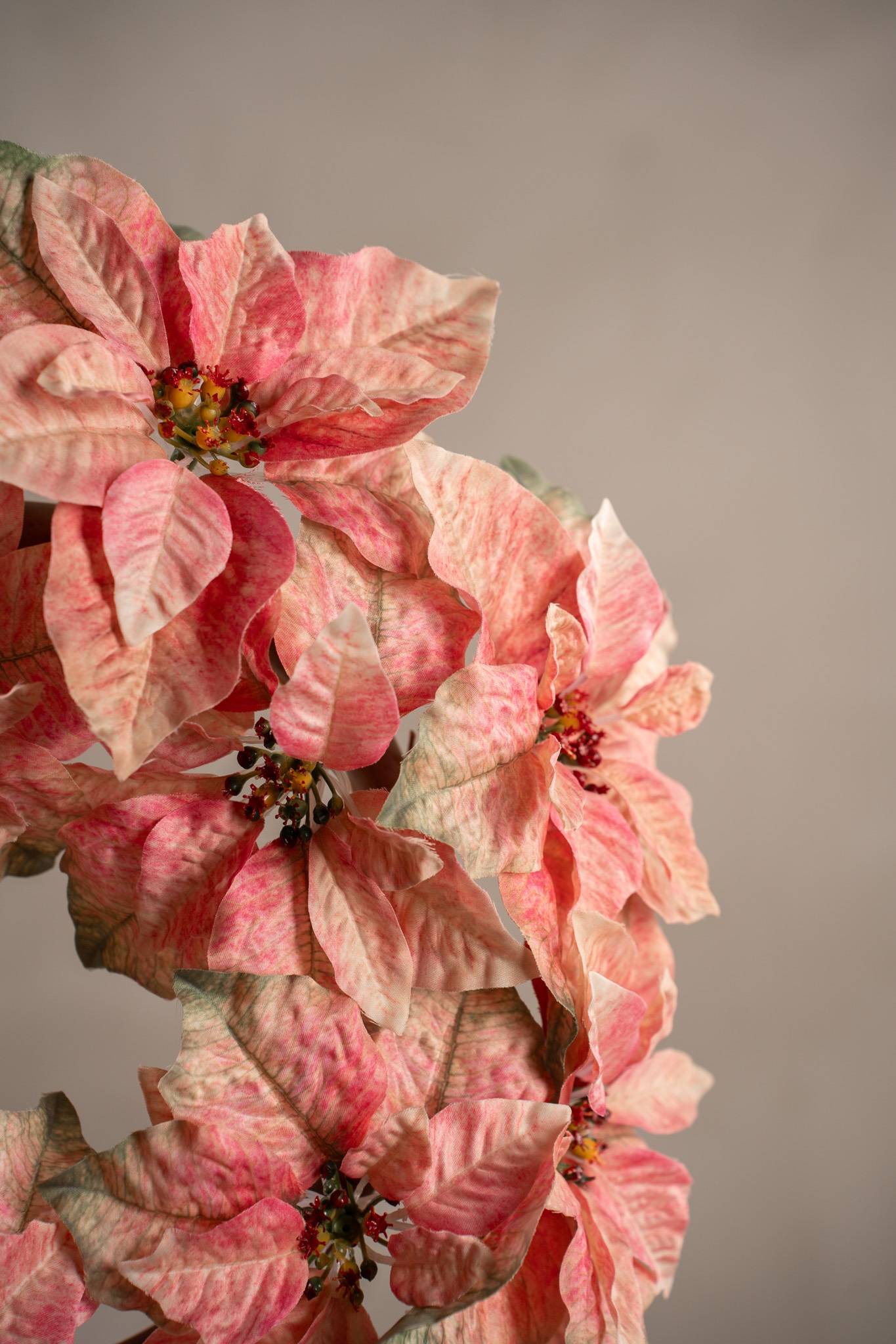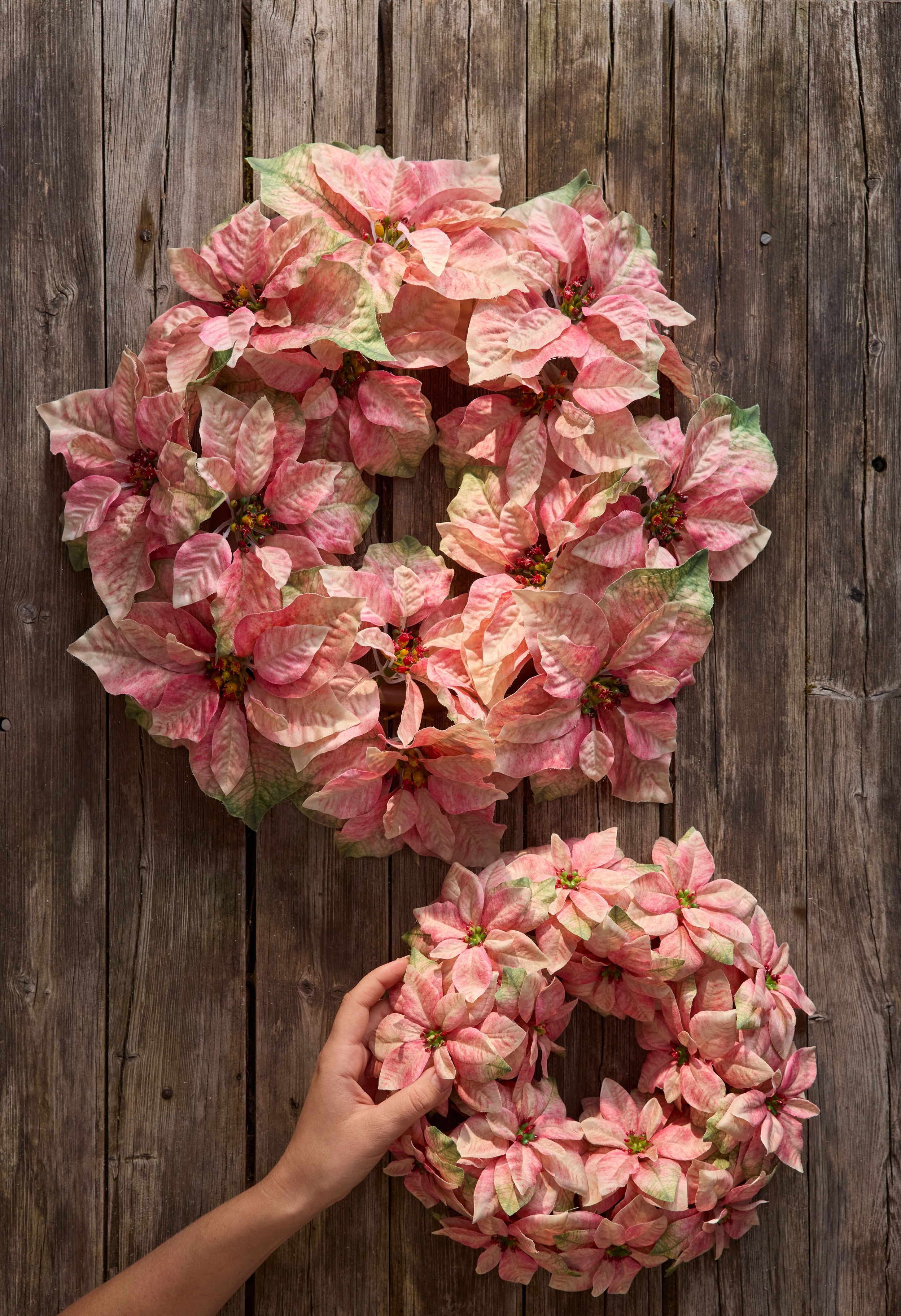 Den rosa julestjernekransen er et stilrent alternativ til den klassiske røde. Med sine myke toner og i størrelser på 30 og 50 cm passer den perfekt hvis du ønsker å skape en moderne julestemning med eleganse.
