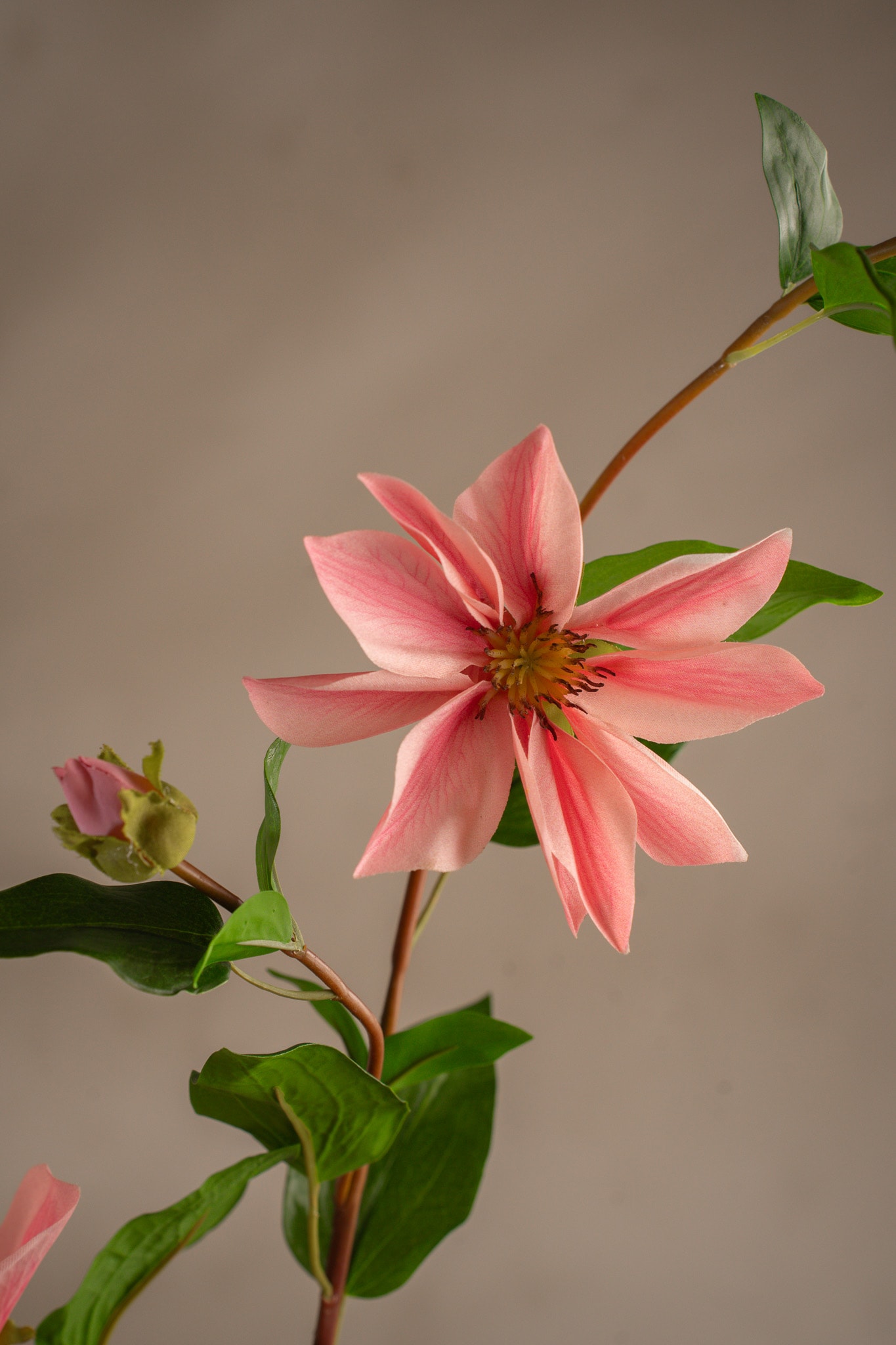 Clematis med sine vakre blomster og slyngende stilker er et stilfullt og holdbart dekorativt element. Denne kunstige planten skaper en romantisk og elegant atmosfære. Plasser den i en vase eller bruk den som dekor på en hylle eller et bord.